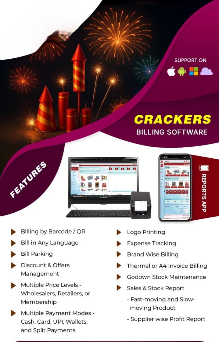 ๐ CRACKERSHOP BILLING SOFTWARE ๐ Simplify your crackers business with powerful, easy-to-use billing software! โ Key Features Barcode / QR Billing Bill in Any Language Bill Parking Discounts & Offers Management Multiple Price Levels โ Wholesalers, Retailers, Membership Multiple Payment Modes โ Cash, Card, UPI, Wallets, Split Payments Logo Printing Expense Tracking Brand-wise Billing Thermal / A4 Invoice Printing Godown Stock Maintenance Sales & Stock Reports Fast & Slow Moving Products Supplier-wise Profit Report ๐ฒ Available On: Android |Windows | Cloud ๐ Reports App included for real-time tracking!